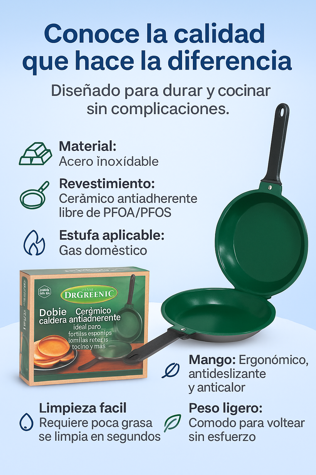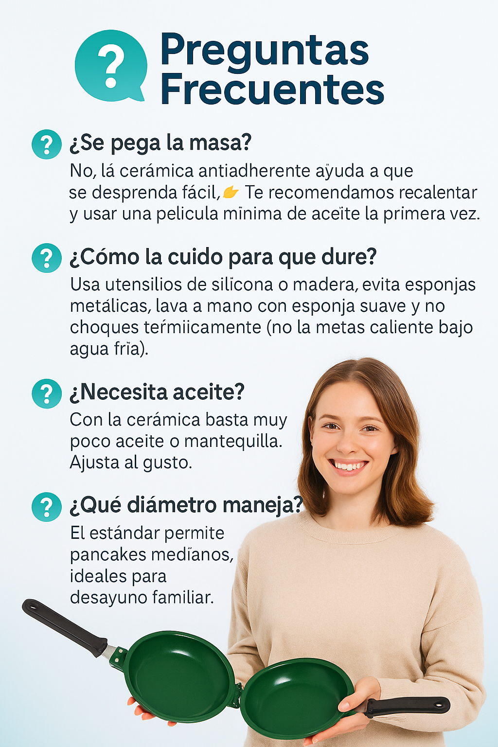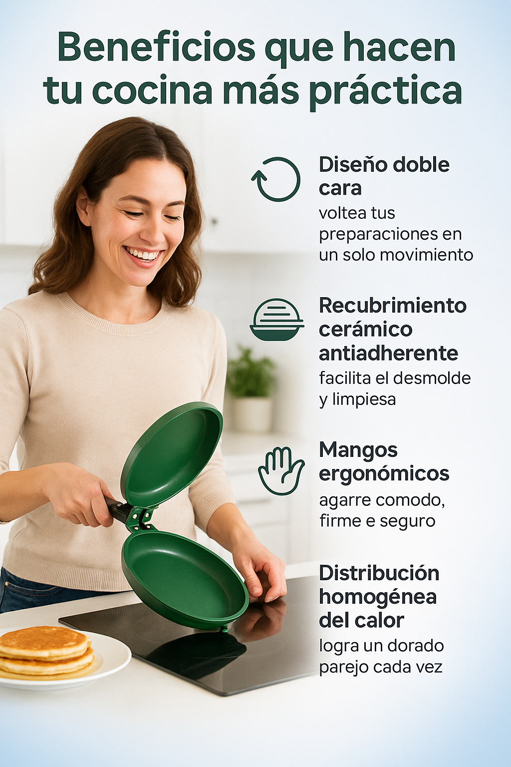 ¡El recubrimiento cerámico antiadherente evita que se pegue la masa y facilita una limpieza rapidita. Menos aceite, menos tiempo, más sabor!
